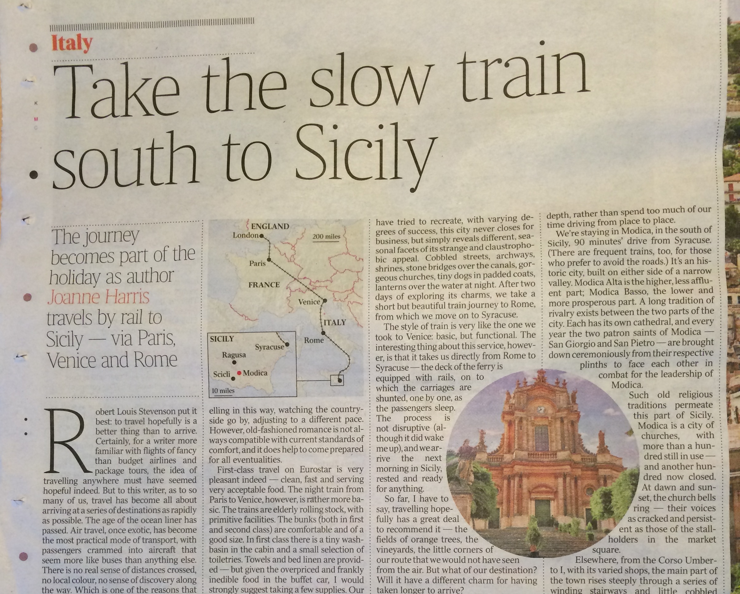 Nel suo lungo viaggio in treno che, attraverso Parigi, Venezia e Roma , l’ha condotta in Sicilia, la Harris non nasconde il suo stupore per la qualità dell’offerta culturale e storica di Modica, spingendosi a raccontare ai propri lettori anche le tradizioni e le leggende che hanno reso immortale questo pezzo di Sicilia, ed esaltando l’ospitalità ricevuta nel corso del suo soggiorno modicano.