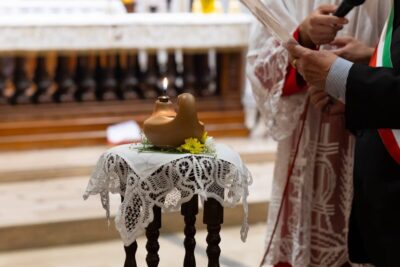 Il rito dell’offerta dell’olio richiama la tradizione francescana: Francesco, dopo aver udito le parole del crocifisso a San Damiano, offrì del denaro al sacerdote per acquistare olio e mantenere accesa la lampada davanti all’immagine sacra. Dal 1926, una lampada arde continuamente davanti alla tomba di San Francesco, con l’olio offerto ogni anno da una regione italiana, a simboleggiare l’unità spirituale e la carità.