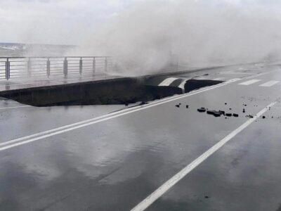 A causa della furia del mare, si è aperta una voragine sotto l’asfalto che ha inghiottito il veicolo. Il conducente è rimasto incastrato e ha riportato ferite varie, ed è stato tratto in salvo dai volontari di soccorso. Per fortuna non ci sono state conseguenze mortali.