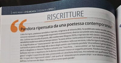 Da docente di Storia, Greco e Latino nei licei di Vittoria a protagonista di un volume scolastico di storia e letteratura greca destinato agli studenti dei licei. Per la scoglittiese Lidia Ferrigno arriva un nuovo, prestigioso riconoscimento culturale con la pubblicazione, da parte della Palumbo Editore, di un volume che le dedica uno spazio di rilievo.