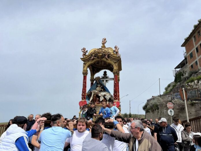 Subito dopo, uno dei momenti più attesi: la tradizionale “Nisciuta” del simulacro dell’Addolorata, accolta da applausi, commozione e dal fragore dei fuochi d’artificio. Un gesto che ogni anno rinnova il legame tra la comunità e la propria storia, trasformando le vie del paese in un percorso condiviso di fede e identità.